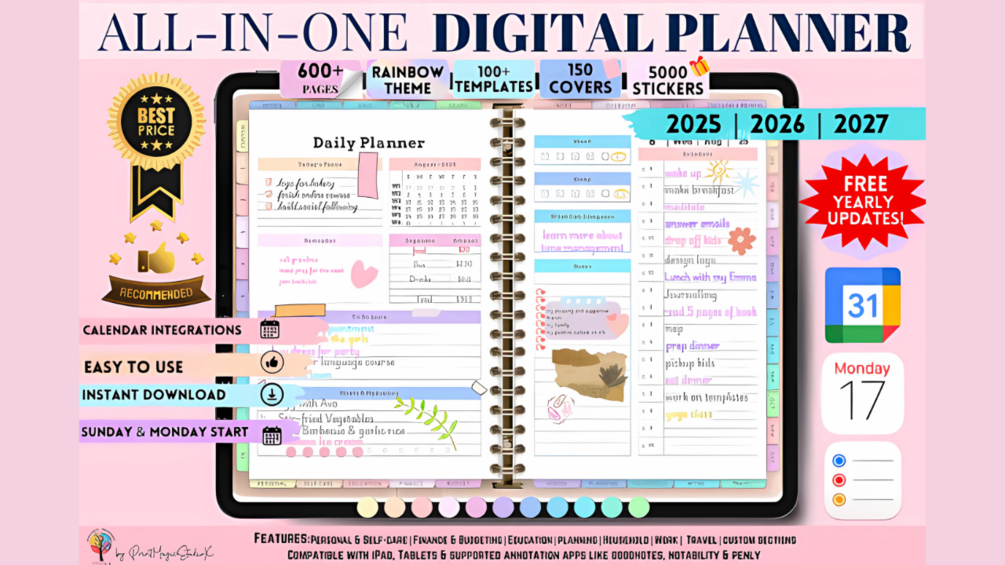 ⭐️Take your productivity, creativity, and organization to the next level with the ultimate All-In-One Digital Planner. This vibrant, rainbow-themed planner features 86 templates across every aspect of your life, from personal development to education, budgeting, and travel. Fully customizable with 5000 stickers and 150 unique covers, this digital planner is compatible with both Apple and Google devices, offering seamless integration across all your tech. Plus, enjoy free yearly updates that ensure your planner stays up to date with the latest features!